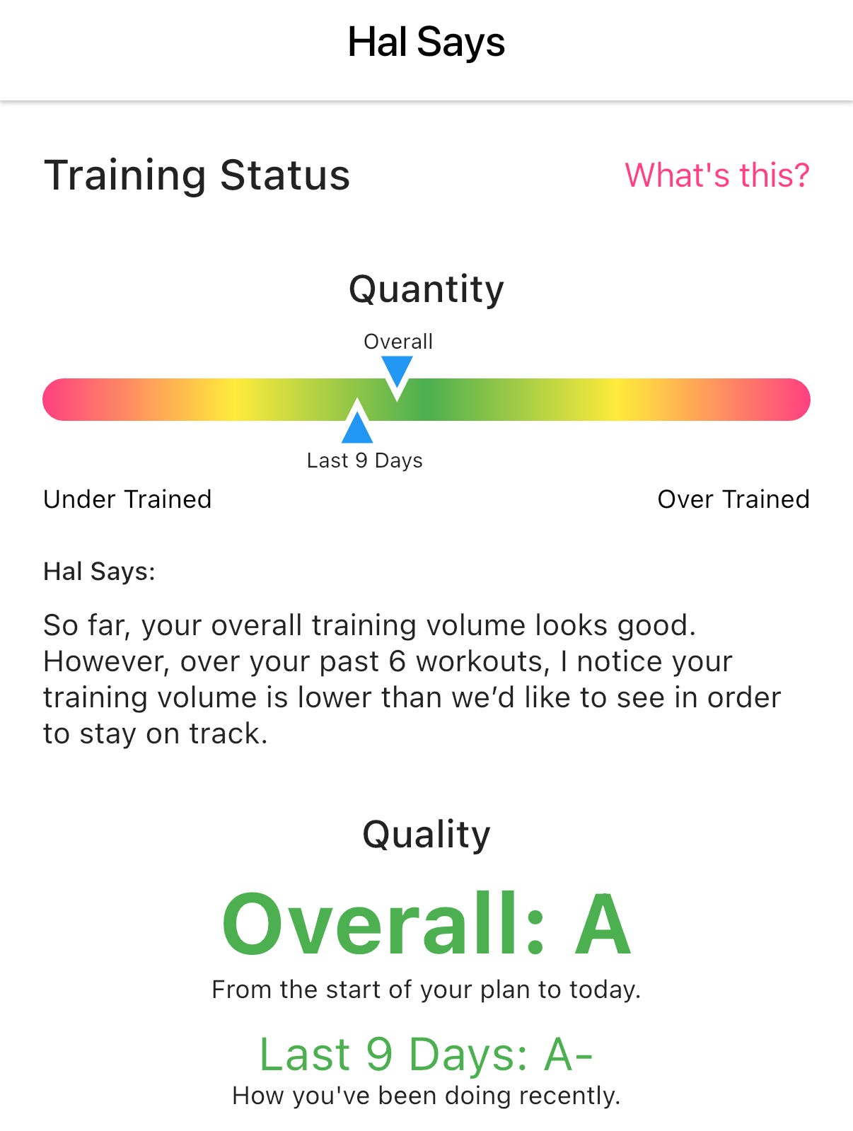 Until this week, I had an A+ rating for both overall training and the past 9 days. I hit every run perfectly. Now, thanks to two small decisions that were objectively good for me, I’ve got an A-.